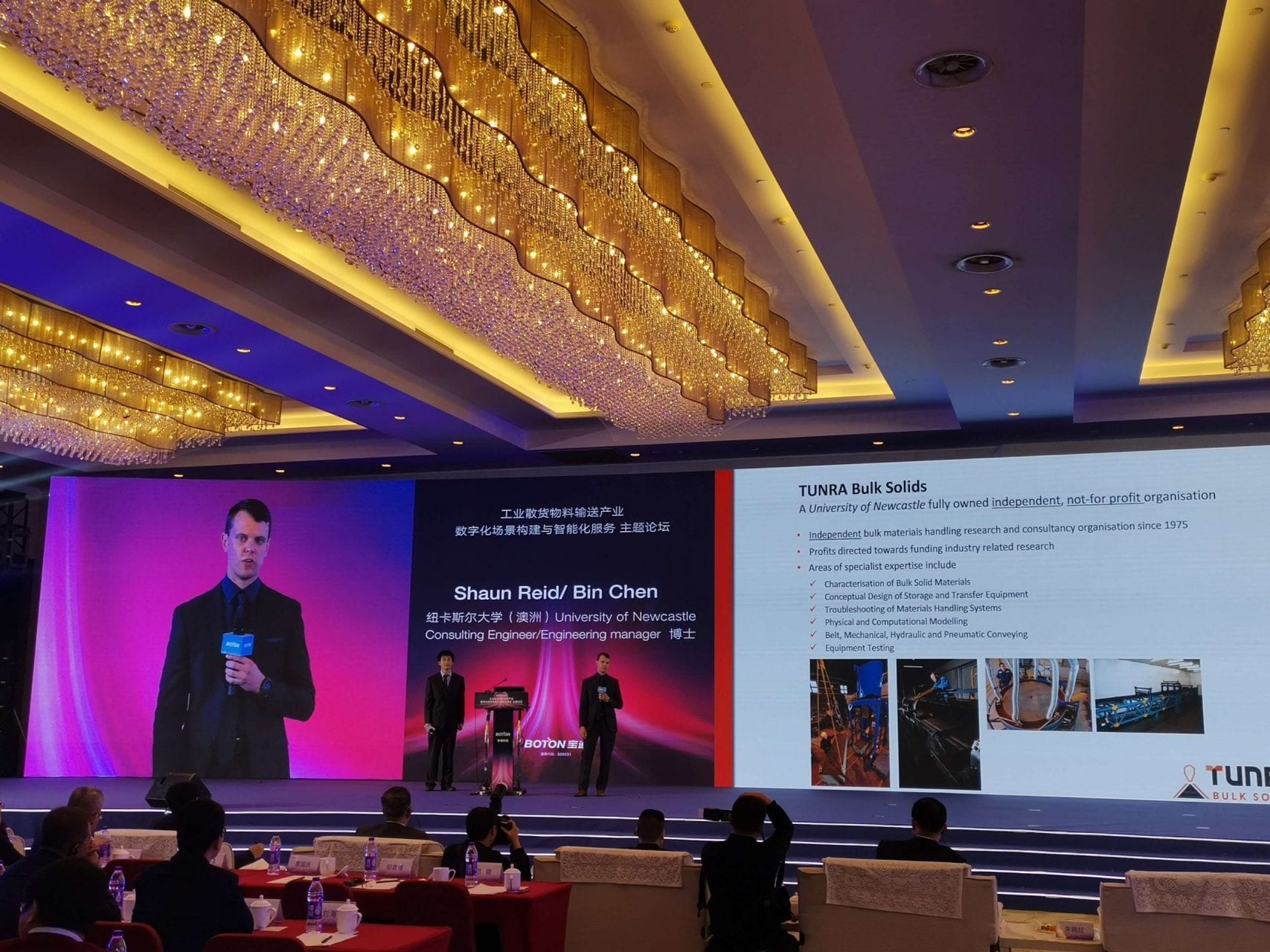 Dr Bin Chen and Shaun Reid travelled to Wuxi City, China, to attend and present at the “Digital Scene Construction and Intelligent Services Forum for Bulk Material Handling”. This engagement was at the invitation of the forum organisers, Wuxi Boton Technology. The audience consisted of senior representatives of various local and international staff, clients and suppliers of Boton. Shaun gave an overview of TUNRA’s capabilities and our place in the industry followed by Bin’s presentation, which contributed to the forum’s theme of innovation by presenting the latest developments in the Rail Conveyor technology developed by the bulk solids group at the University of Newcastle.